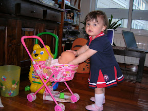 In our fair city parents are very relaxed. Kids 'borrow' each others balls and trikes and toys at the park; parents intervene if the kids get testy, but in general there is a fine sense of community. When Bianca isn't riding her trike, other kids will come up and ride it and as long as she doesn't notice and throw a fit, its no big deal. After all, she does the same to other kids little motor bikes and baby strollers. This stroller, though, must have crack laced handles. Every time the little girl who owned it would leave it, Bianca - or some other chica - would pounce on it. She pushed it up and down the step onto the play ground proper. She chased other girls when she wasn't the first one to it. The other little girl would finally notice, throw a fit, and some parent would return it to her; dealing with their own, now screaming, child. After about ten minutes of this we'd had enough. Ewa's friend Marta was telling us they had these strollers in the Chinese shop 150m away and that they were only 6 euros "that's only 5 dollars" she interrupted her stream of Spanish to say, in English, and then offered to give me the money to get it - one, she needs a currency value lesson and two, I don't need to take a loan to buy my daughter a baby stroller so she'll stop screaming. Though we swear we are not the type of parents who do this, we bought her the f%&E**king (I mean, 'broccoli') stroller. It was 8 euros and possibly the best money ever spent. She has not let it out of her site for the last 24hrs. She pushed it all the way home last night and pushed it all the way to the park and back twice today. And just like yesterday, whenever she abandoned it to lay claim to the swing - which she believes exists only to satisfy her dreams of going back and forth - some other little girl would snag it; hissy fit, stroller returned, stroller abandoned to go to the swing.... lather, rinse, repeat.